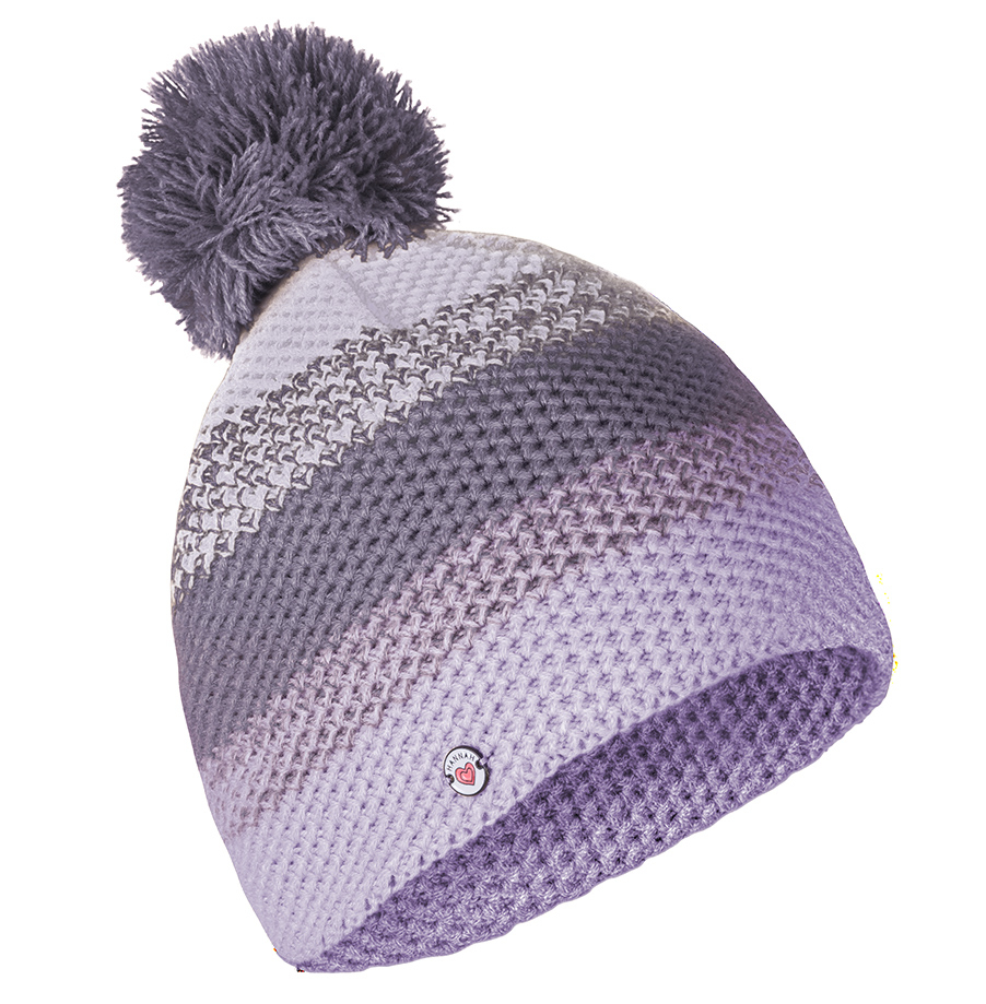 El gorro de invierno para niña de diseño moderno tiene un cálido forro polar que cubre todo el interior hasta la parte superior del gorro. El tricotado de hilo acrílico mezcla los colores y tiene un rico bolillo con volantes en la parte superior y un logotipo decorativo en el lateral del ala inferior.